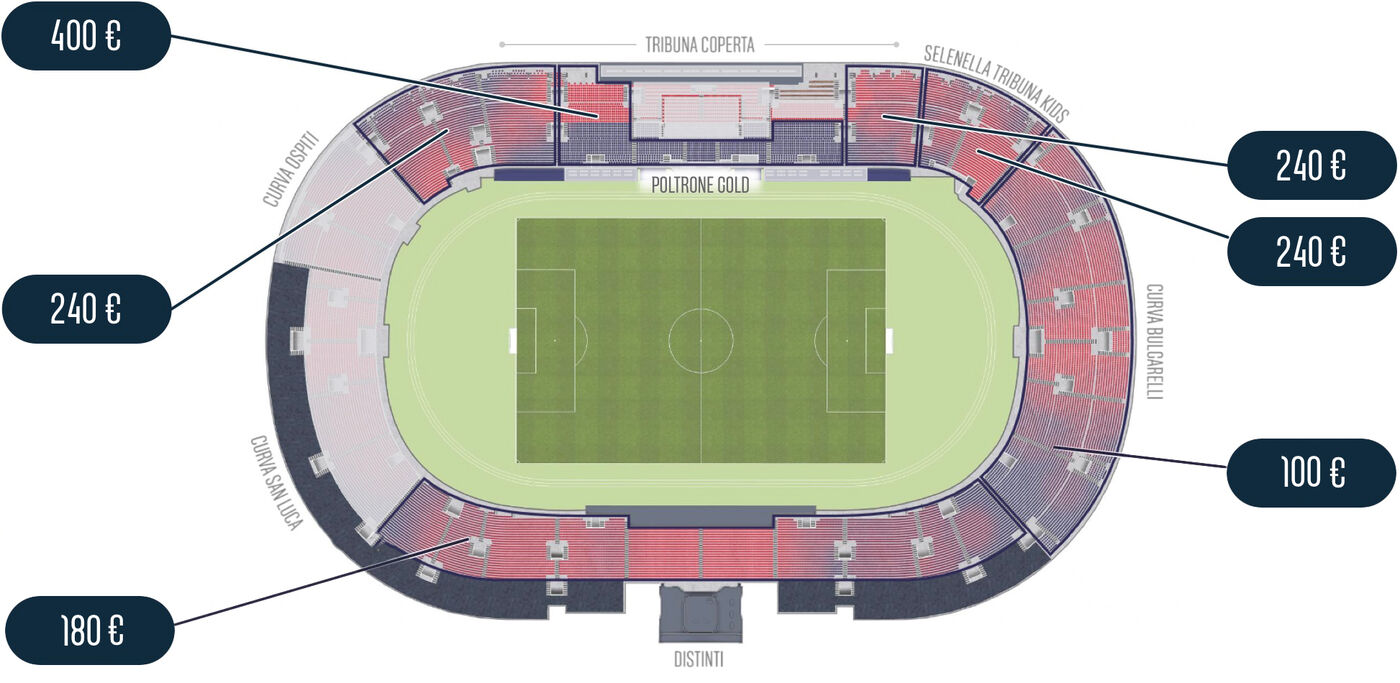 | Tribuna Coperta | 240 € | 170 € | 240 € | 170 € | 280 € | 195 € | 300 € | 210 € | ||